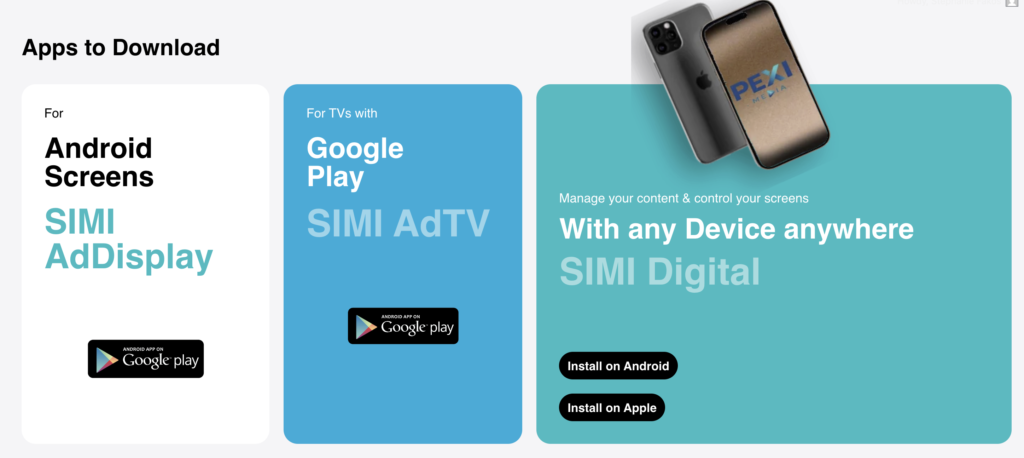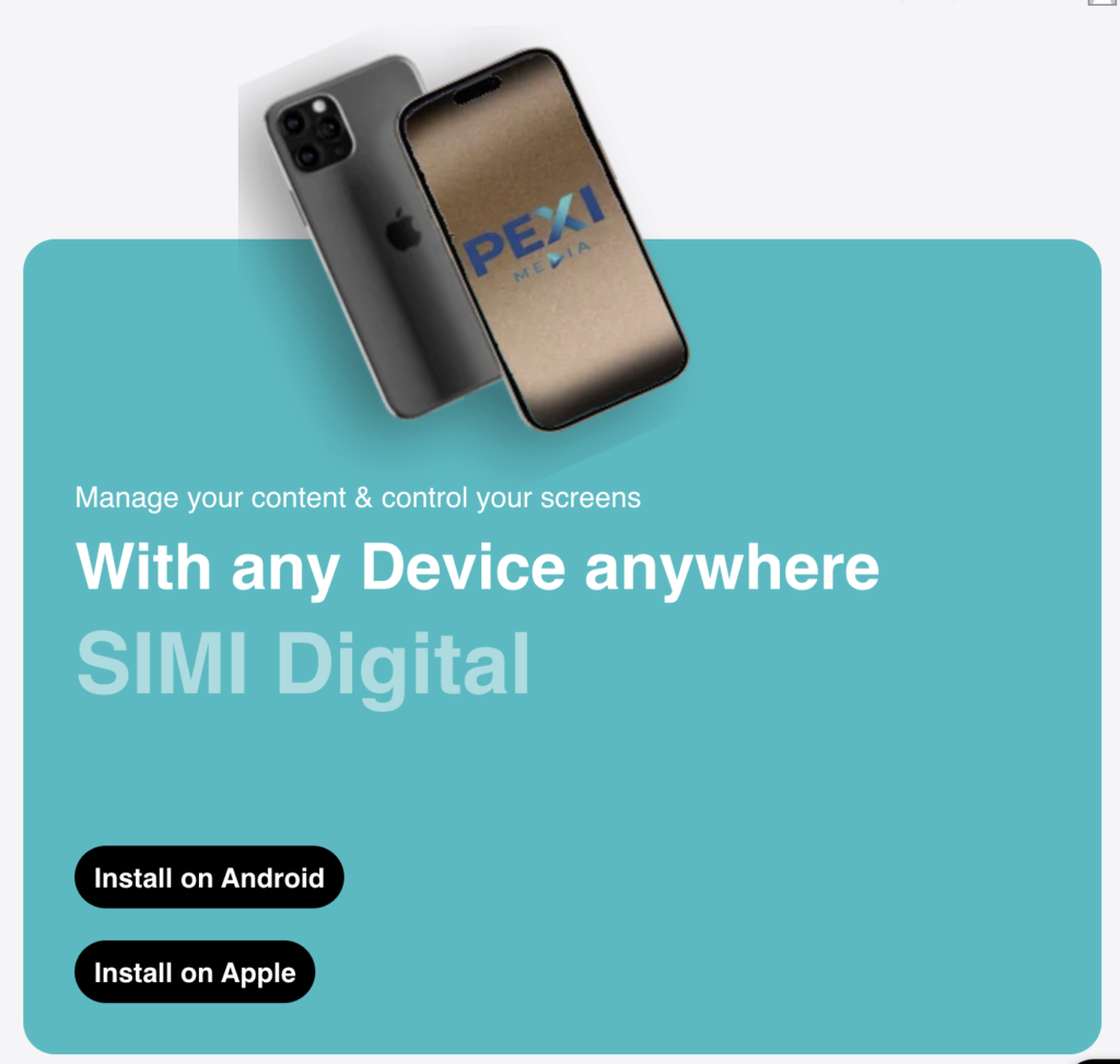 Download the SIMI app to suit your screen. For Smart TV’s & media streaming devices with Google Play Store, download SIMI AdTV. For Android screens download SIMI AdDisplay. SIMI Digital is your control centre. We also recommend that you download a shortcut on your mobile to create, display & Advertise on the go. Available for Apple & Android. Click here for instructions.